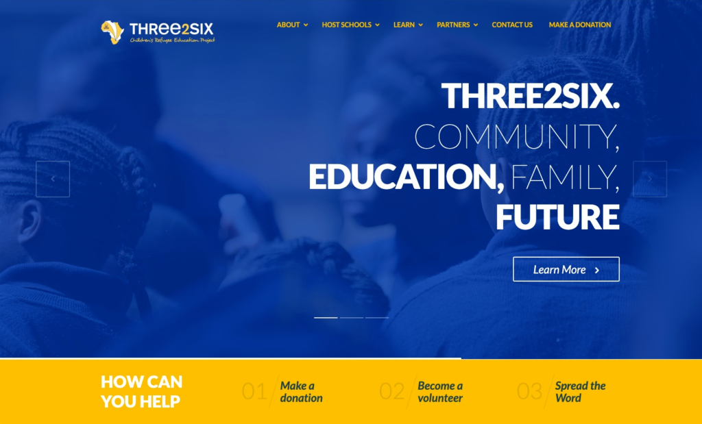 Navigation consistency: Top menu matches the established brand while offering immediate access to key content areas (Host Schools, Learn, Partners, Contact, Donate)